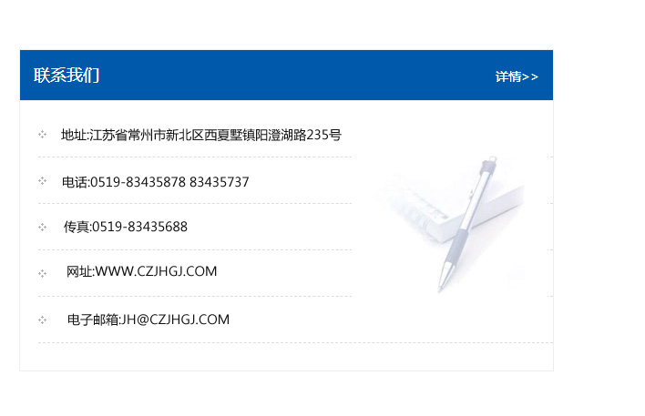 地址:常州市新北區友邦商務大廈1幢16、17層  電話:0519-85101652  傳真:0519-85112595  郵編:213022  網址:www.cz-jiayue_cn.czcqmjzx.com  郵箱:xiajifengaa@163.com